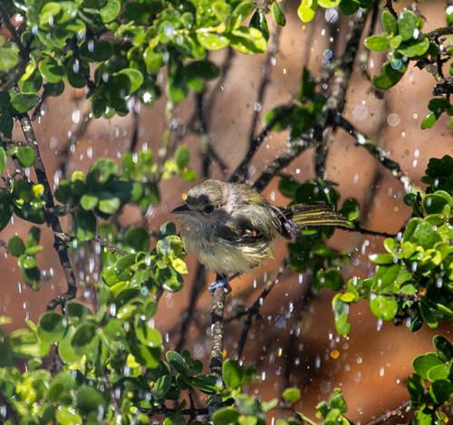 Juvenile Lesser Goldfinch bathing in water spray provided by Caretakers