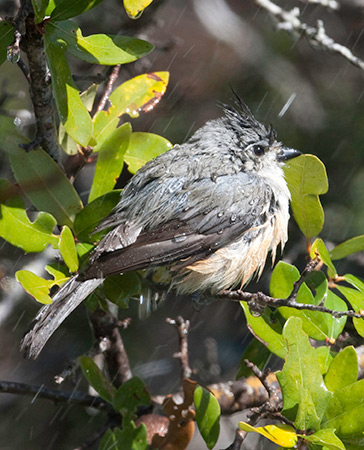 Black-crested Titmouse fluffed up bathing in spray
