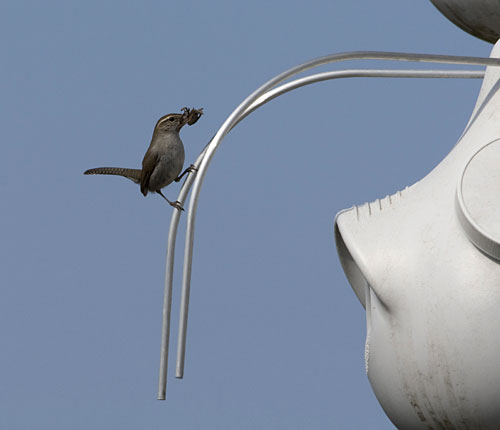 Bewick's Wren bringing nesting material to Purple Martin house