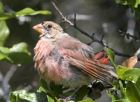Juvenile male Cardinal puffed up while bathing