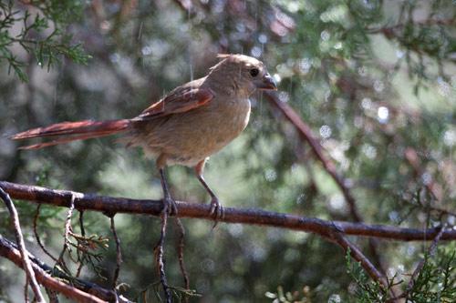 Juvenile male Cardinal perched on a Juniper branch in the rain