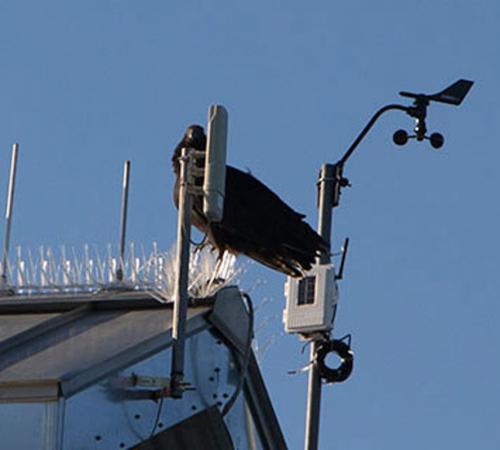 This Black Vulture is undeterred by the "bird spikes". The clear pastic spikes were erected to prevent bird droppings onto the roof that collects rainwater for household use.