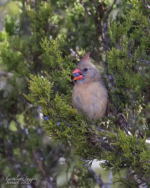 Female Cardinal demonstrating the value of Ashe Juniper berries. The Ashe Juniper tree provides valuable forage for wildlife in the winter.