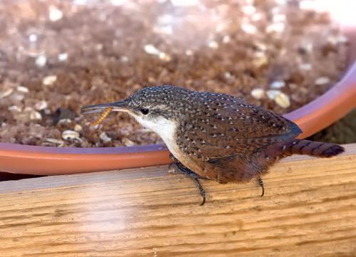 Canyon Wren gets a meal worm from the bowl.