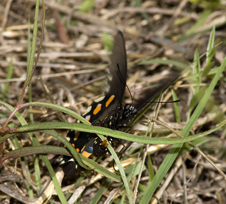 Female Pipevine Swallowtail ovapositing (laying eggs) on Swanflower