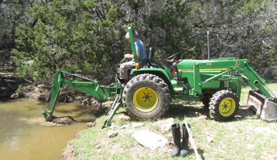 A tractor is used to remove invasive pond plant
