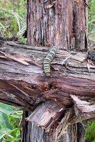 Monarch Caterpillar climbs onto a fence post to begin transformation into a chrysalis
