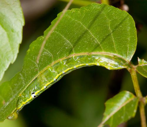 Hippia packardii caterpillar, camoflaged while feeding on Mexican Buckeye tree leaf