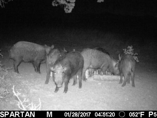 A sounder of feral hogs is seen on the willdife camera in the pasture at the deer hunting feeding area.. Efforts were taken to install a large hog trap. They were finally removed on March 22. (see journal entry for more information)