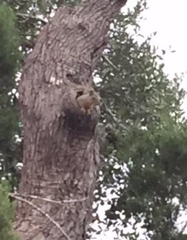 Squirrel looks out of its home in a tree cavity. This is the reason to leave tree snags, so that animals have a home.