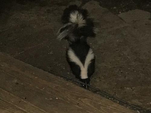 Skunk at feeding area, eating peanuts.