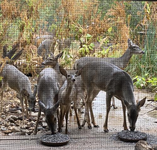 Herd of Deer eating sunflower seedss at porch