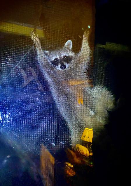Young Raccoon climbing on window screen looking inside