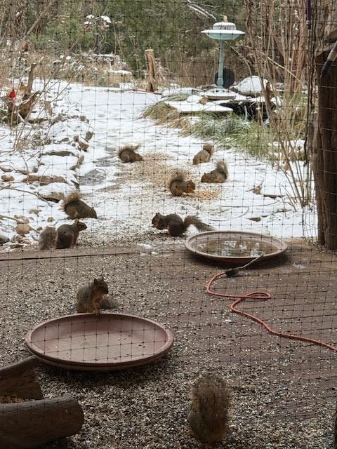 Squirrels eating sunflower seeds on snowy day