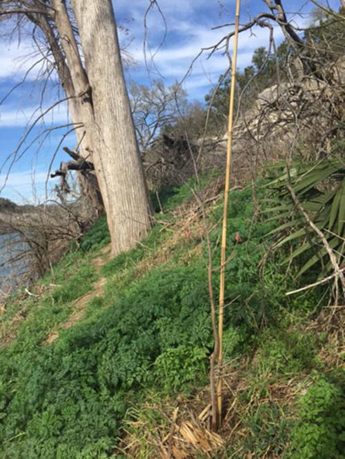 Newly planted 5 gallon Bald Cypress tree along the river. The bamboo stake holds the tree upright.