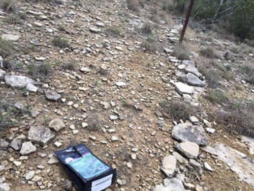 Scattered "Caliche Mix" native Texas seed blend from Native American Seed in bare spot at old fence line. A small rock berm is set out on countour to help secure the seeds and the land.