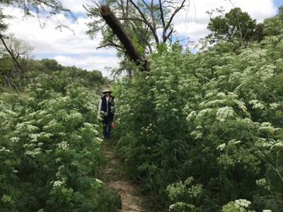 Caretaker wades through poison hemlock or water hemlock (Conium maculatum) along river trail. This has been a host plant for Black-swallowtail butterflies.