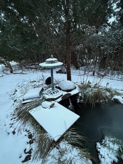 Pond and water fountain with frozen water