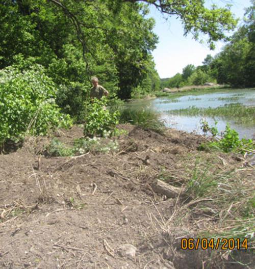Caretaker observing damage to river island due to Feral Hogs uprooting plants.