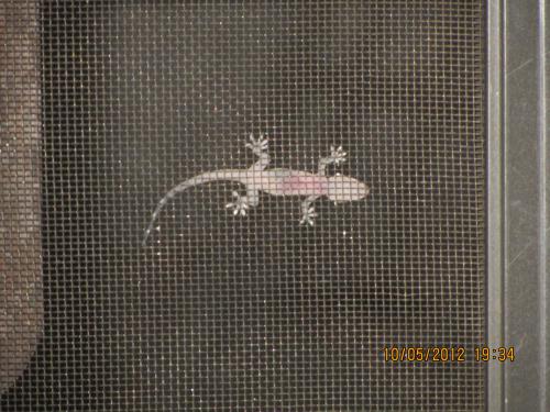 Mediterranean Gecko on screen door, very young and only a few inches long