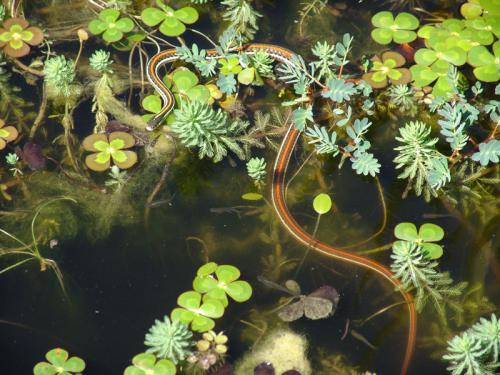Red Striped Ribbon Snake in frog pond (non-venemous)