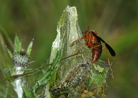 Red Wasp hunting Painted Lady Caterpillar safely protected in tent web