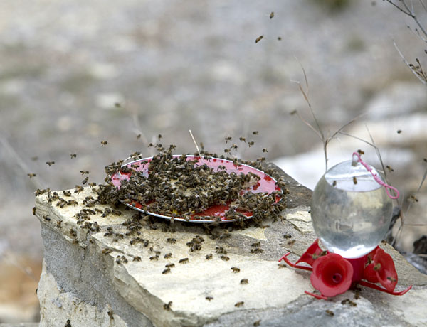 Sugar water on plate to recover hummingbird feeder