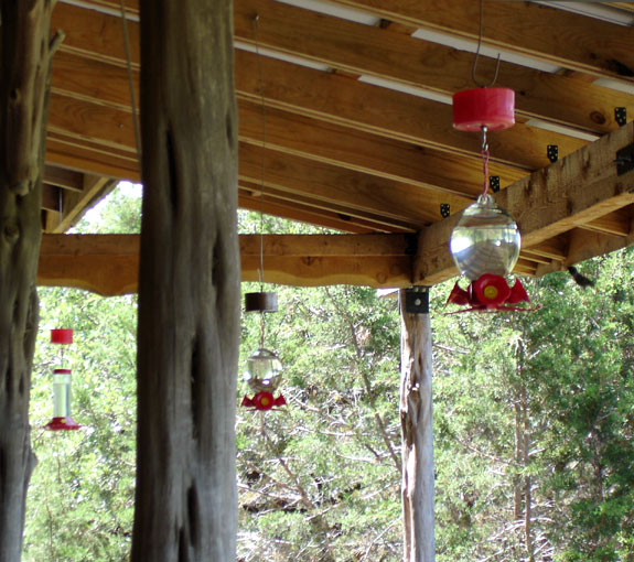 Hummingbird feeders with ant guards hanging from porch rafters