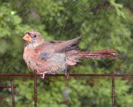 Northern Cardinal bathing in water spray