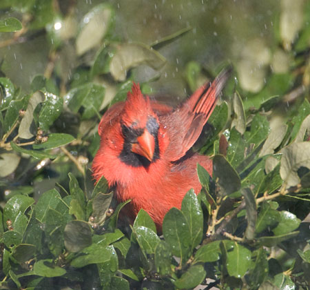 Male Northern Cardinal bathing in water spray