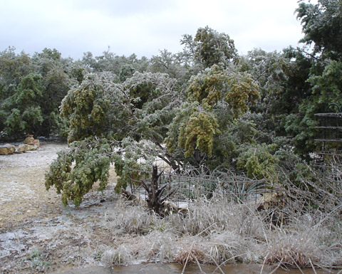ice laden drooping Ashe Juniper trees