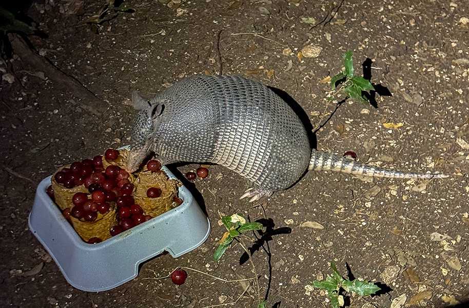 Armadillo eating at night feeding bowl of canned dog food and grapes