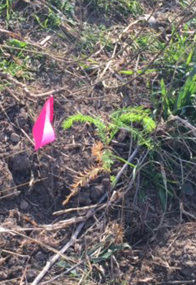 A pink survey flag marks a newly planted Cypress tree, to help monitor over time.