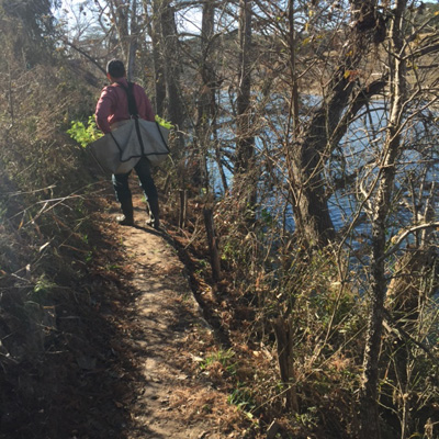 Professional tree planters plant 1000 trees along approximately 2500 feet of the Blanco River. He is carrying bare root baby Bald Cypress trees in the bags.