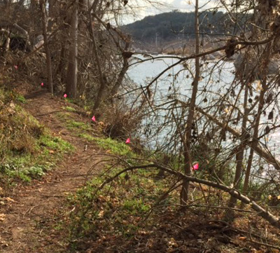 Pink flags mark the location of newly planted Bald Cyrpess trees.