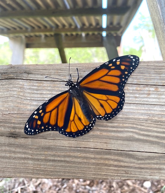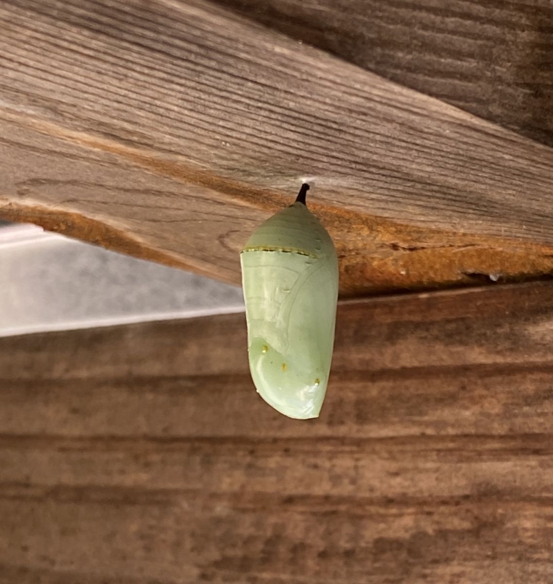 Monarch Butterfly emerges from its chrysalis under picnic table