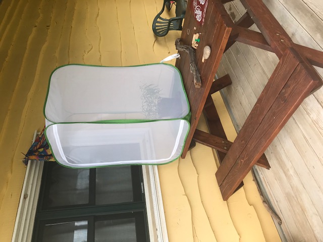 Caretkaers set up butterfly enclosure with an Antelope Horn milkweed plant to house found Monarch Caterpillars