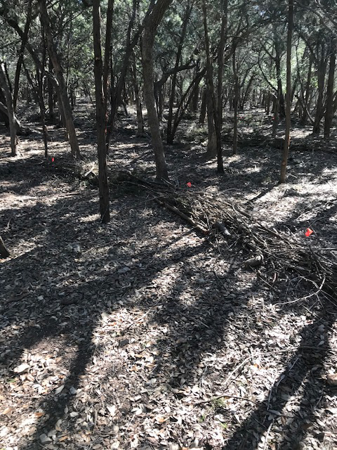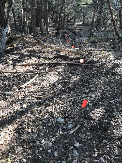 The orange flags are marking the natural contour of the land, to place Ashe Juniper poles, brush and rocks for erosion control.