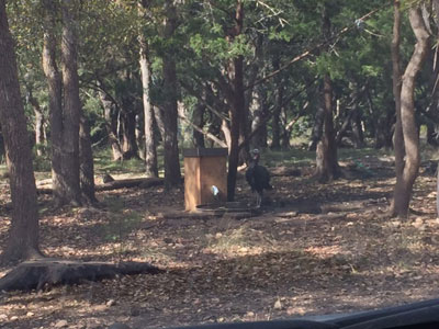 Turkey at water guzzler. Turkeys are not hunted on the land.