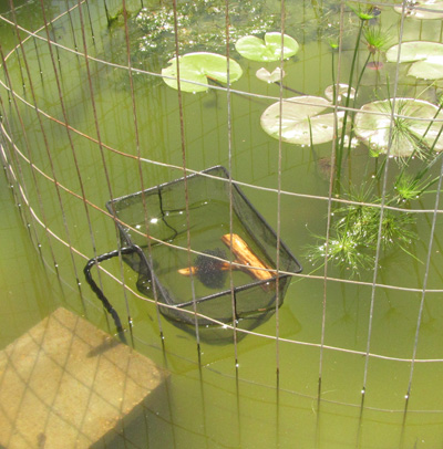 Leopard Frog eggs were laid in an overflow bucket overnight. Caretakers relocated the eggs into a net in the new large 8 foot water tank. The net will keep them secure from predation until they are mature enough to release. The cage protects water lilly and other pond plants from being browsed by Deer.