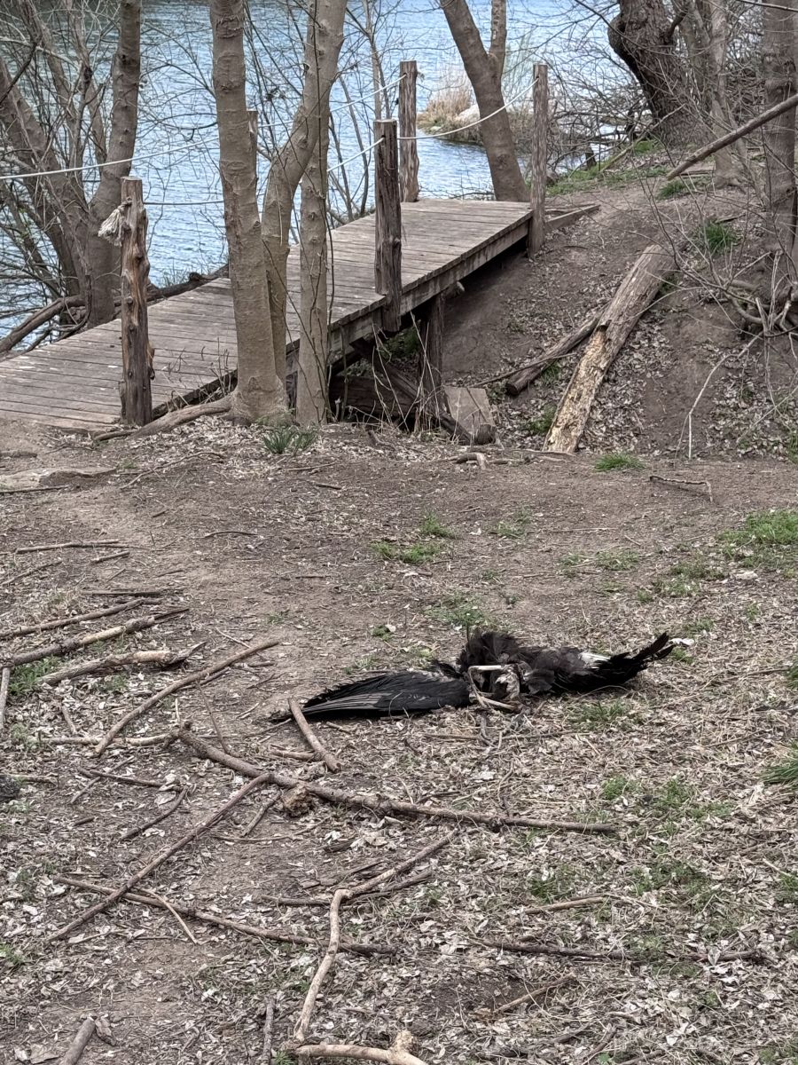 This is one of many dead Vultures found along the river bottom. Caretakers suspect bird flu as the cause.