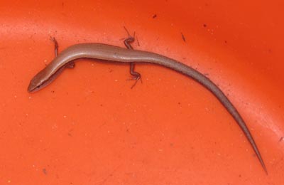 This Skink was removed from the middle of the road, placed in an orange bucket and relocated to the woody area near the bathtub pond.