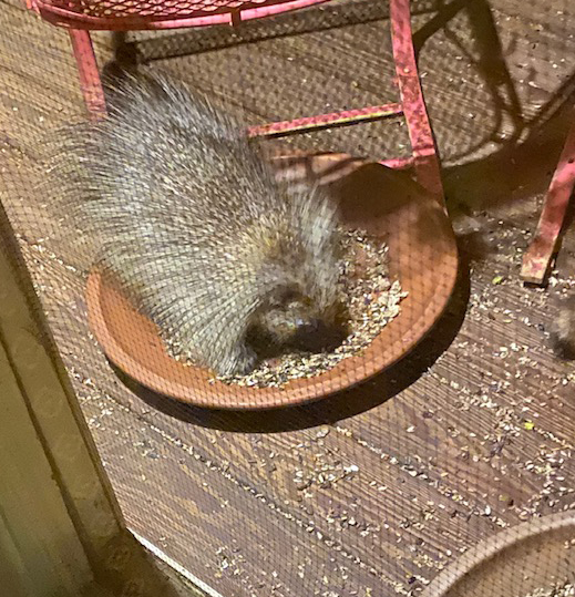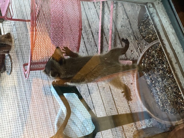Raccoon looks in the window from the feeding seed bowls on the porch