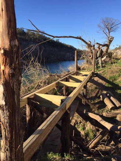 A bridge spans a deep ravine at the draw to allow access along a newly designed river walking trail.