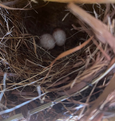 Wren nest with eggs, in coil of electic cord in Pole Barn.