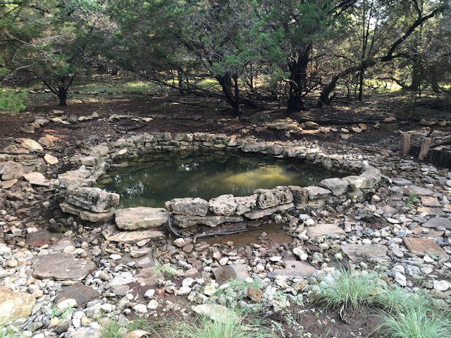The Man-made rock pond full of water after rains. It is designed so that water in the draw flows around the edge of the main body of water in the pond. There is a float valve connected to a water hose from the water well to keep the pond full of water year round.