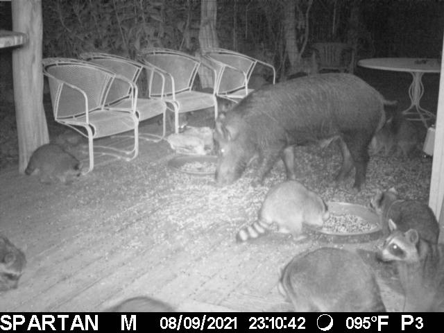 Old Feral Hog Boar on the porch eating birdseed with Raccoons and other nocturnal animals.