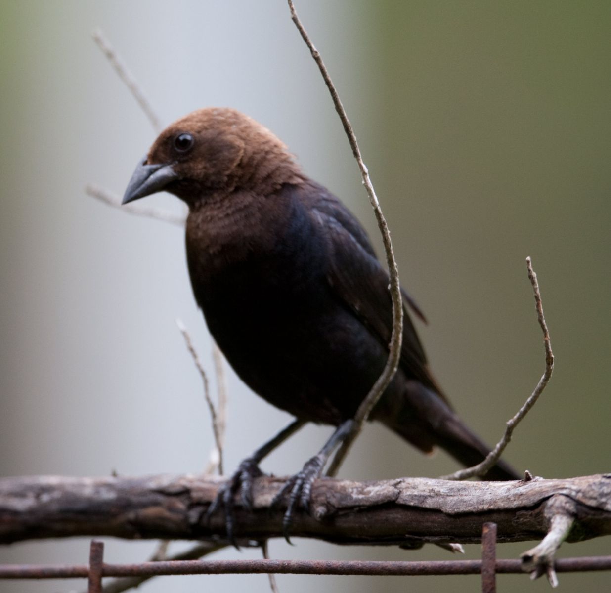 Caretakers note: The Brown Headed Cowbird is a nest parasite species that lays its eggs in songbirds nests. The Brown Headed Cowbird female sometimes kicks the songbird eggs out of their nest. The Brown Headed Cowbird fledgeling is larger and hatches sooner than the songbird eggs, causing the songbird female to favor feeding that youngster instead of its own. This behavior is adapted from following herds of buffalo many years ago. Now days, the Brown Headed Cowbird is found near cattle ranches.