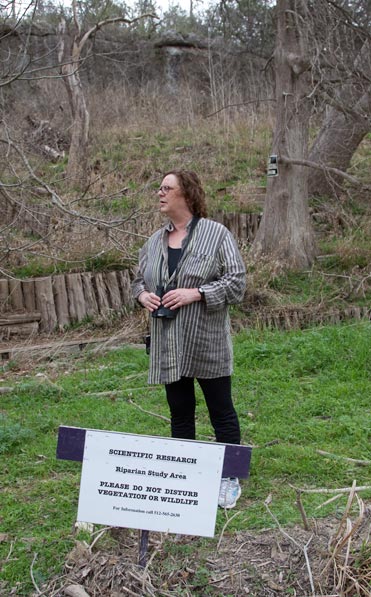 Sign at River island reads "Scientific Research, Riparian Study Area, Please Do Not Disturb Vegetation or Wildlife, for more information call..."