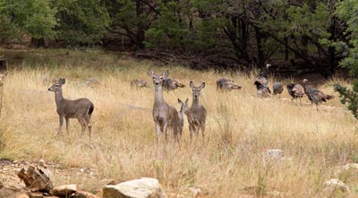 White-tailed Deer watch and Wild Turkeys eat sunflower seeds that were scattered on the ground for them by the Caretaker. The Turkeys were persistent in chasing the deer away from their feedeing area.